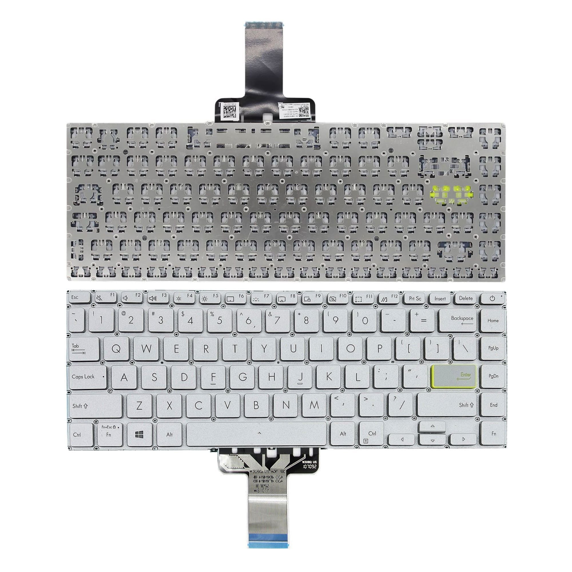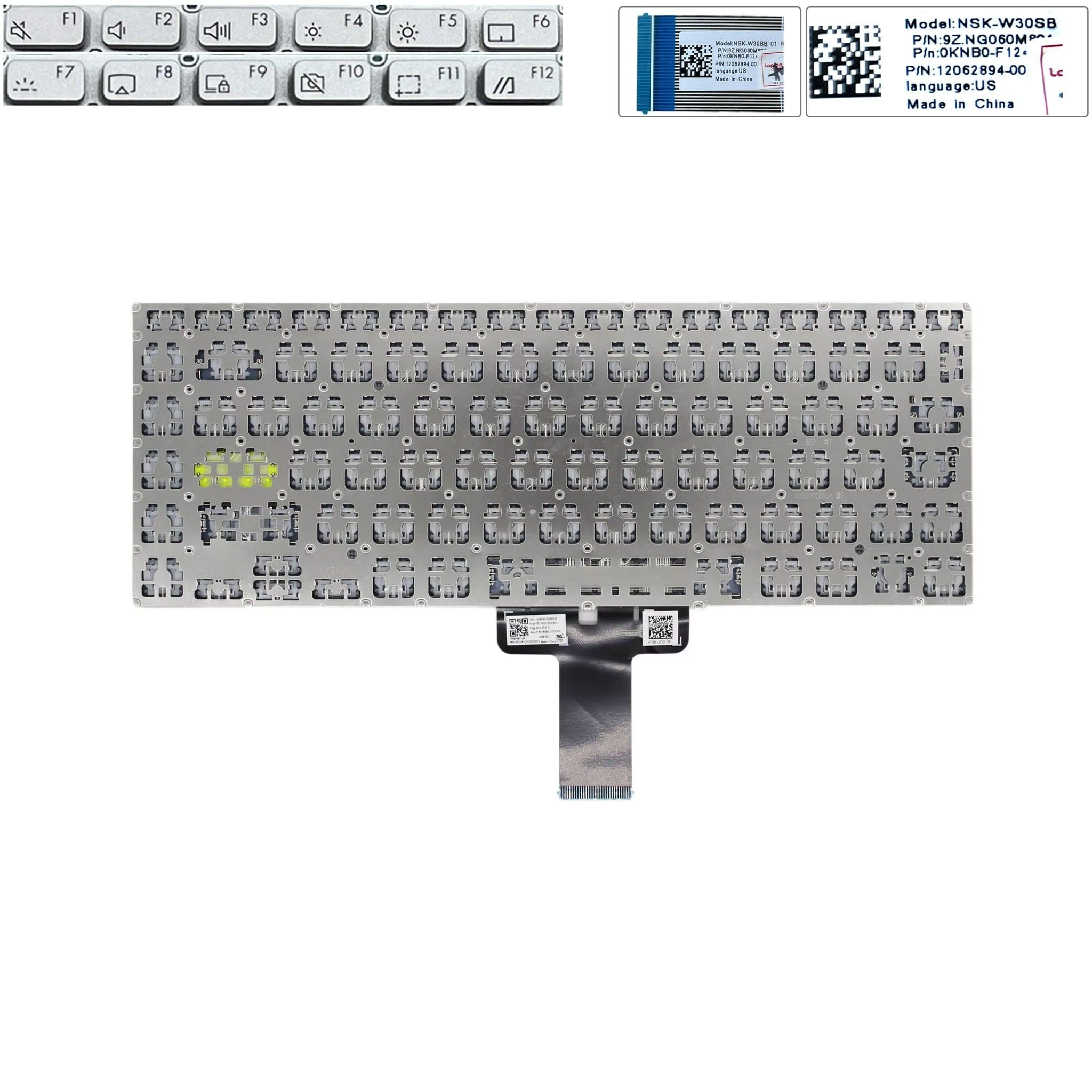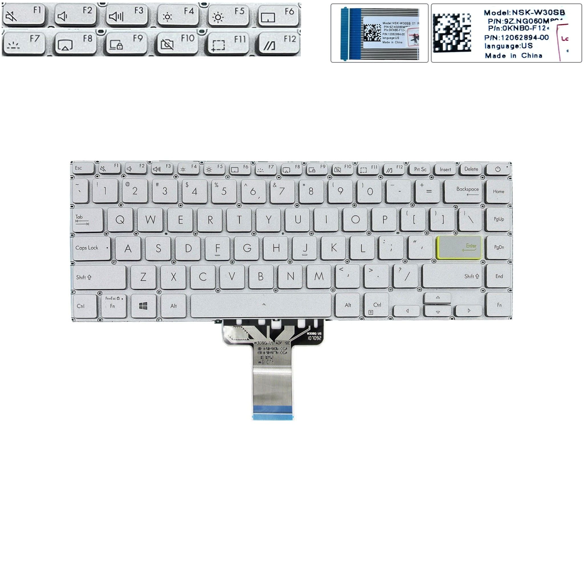 Bàn phím Asus VivoBook X421 NSK-W30LN-US US Phím bạc Chữ đen Đèn Nút nguồn Không khung Nút Enter viền xanh & M433 E410 E410M A415 (ORG +)