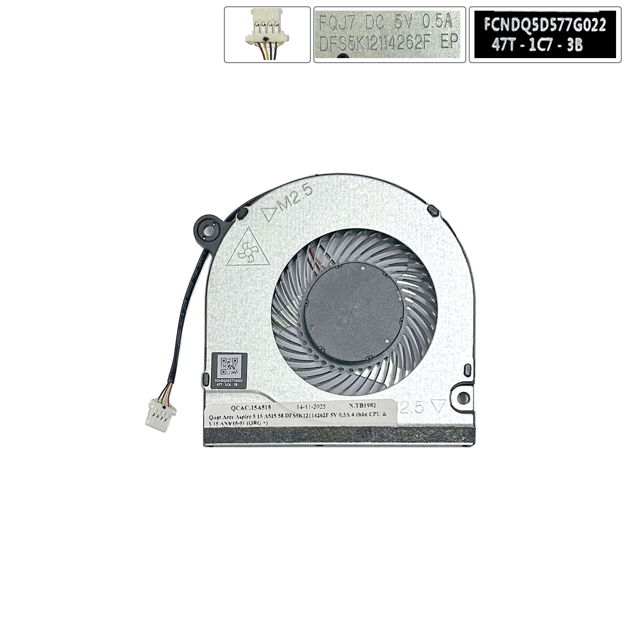 Quạt Acer Aspire 5 15 A515 58 DFS5K12114262F 5V 0,5A 4 chân CPU & V15 ANV15-51 (ORG +)