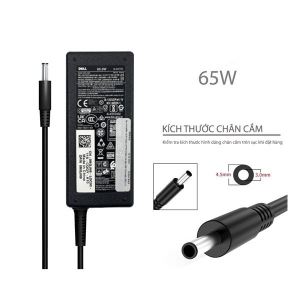 Sạc Dell 65W 19.5V 3.34A 4.5*3.0 Chân tròn kim nhỏ Chữ nhật (ORG +)